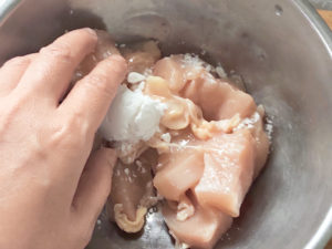 ![]() 2:ボールに鶏肉と片栗粉を入れ、手で粉を全体にまぶしましょう。 |