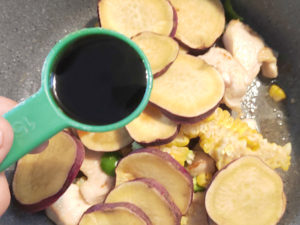 ![]() 8:鶏肉に火が通ったら、とうもろこしとピーマンを入れて1分ほど炒め、さつまいもも加えたら、醤油を加えて、さらに1分ほど炒めましょう。 |