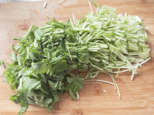 ![]() 1:水菜は根元を切り落とし、3cm長さに切ります。 |