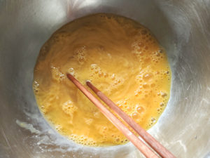 ![]() 2:ボールに卵をとき、ほんだしと水を入れてよく混ぜましょう。 |