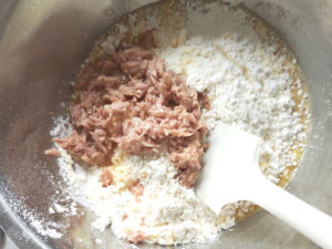 ![]() 3:ボールに薄力粉とツナ、チーズを加え、良く混ぜあわせます。 |