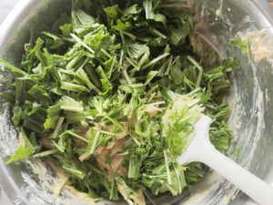 ![]() 4:水菜もボールに加え、全体に生地が絡むように混ぜましょう。 |