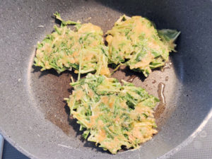 水菜は小さめに切ると、生地にもなじんで焼きやすくなります。