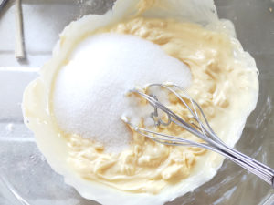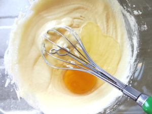 ![]() 4:ボールに、卵を1個ずつ加え、その都度良く混ぜましょう。 |