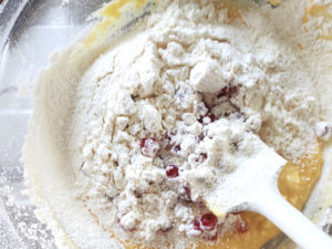 ![]() 6:赤すぐりもボールに加え、粉をかぶせるようにして残りの粉をふるい入れましょう。 7:再び、ゴムベラでさっくりと混ぜます。 |