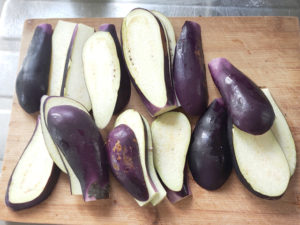 ![]() 1:なすはヘタを落とし、縦に4~5等分します。 |