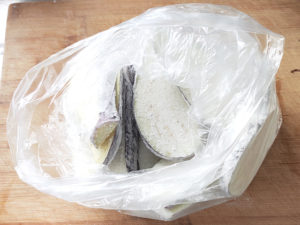 ![]() 2:ビニール袋に、片栗粉と切ったナスを入れ、ゆすって粉をまぶしましょう。 |