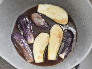 ![]() 7:揚げたなすをタレのフライパンに加え、たれを全体に絡めます。 |