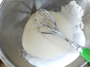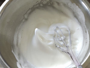 ![]() 12:ボールに生クリーム、クリーム用砂糖、レモン汁を加えて泡立て、とろーっと落ちて跡が残るくらいの緩いクリームを作り、使うまで冷蔵庫に入れておきます。 |