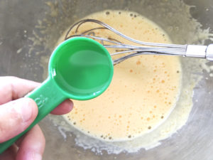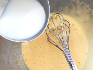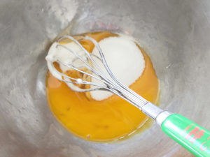 ![]() 3:卵黄のボールに砂糖を加えて泡立て、白っぽくとろりとするまで泡だてましょう。 |