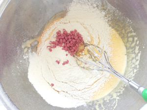 ![]() 7:薄力粉とベーキングパウダー、ラズベリーパウダーを合わせてふるい入れ、粒ジャムも加えて、粉っぽさが消えるまで良く混ぜ合わせます。 |