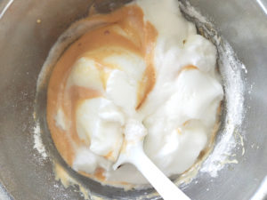 ![]() 8:卵黄のボールにメレンゲを全量加え、ゴムべらに持ち替えて、さっくりと練らないように混ぜましょう。 |