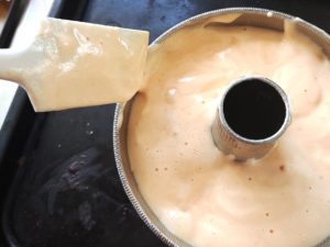 ![]() 9:生地を低い位置から型に流し入れます。 10:縁部分と筒部分に生地をなすりつけるようにして、焼きあがりを助けましょう。 (ボールの底にたまったジャムはゴムベラで均一になるようにそっと乗せます。) |