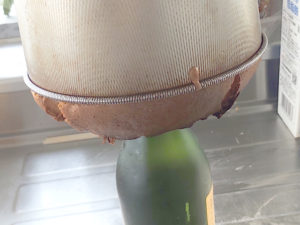 ![]() 11:ケーキが焼けたら、すぐに逆さにして、瓶などに挿し、このまま2時間以上放置しましょう。 |