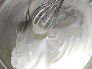 ![]() 1:卵白にグラニュー糖をひとつまみ加えて泡立て始め、クリーム状の固さになったら、残りの砂糖を二回に分けて加えます。 2:ピンと角が立つまで泡立てましょう。 (メレンゲ) |