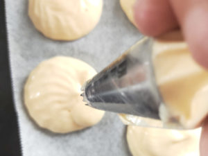 ![]() 6:天板にオーブンシートを敷き、6㎝の円を描きます。 7:生地を丸口金を付けた絞り袋に入れ、上に引っ張るようにして円形に絞り出しましょう。 |
