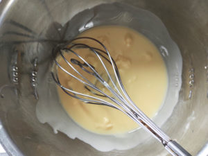 ![]() 3:卵黄を良くときほぐし、メレンゲのボールに入れましょう。 4:泡立て器を垂直に立て、クルクルと縞々が見えなくなるくらいまで混ぜます。 |
