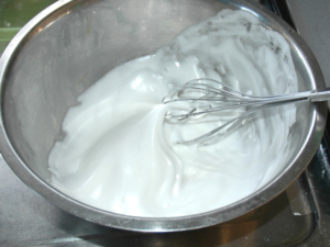 ①卵白にグラニュー糖をひとつまみ加えて泡立て始め、クリーム状の固さになったら、残りの砂糖を二回に分けて加え、ピンと角が立つまで泡立てます。
