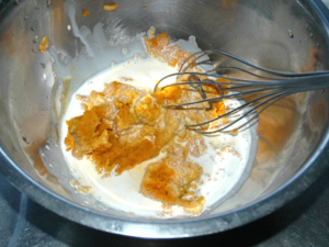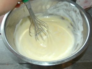 ③泡立て器を垂直に立て、クルクルと縞々が見えなくなるくらいまで混ぜましょう。