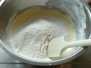 ④薄力粉と片栗粉を一緒に振るい入れ、ゴムベラに持ち替えて、さっくりと練らないように混ぜます。