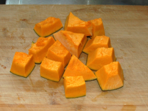 ⑧かぼちゃは、種とワタを取り、一口大に切ります。