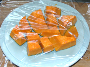 ⑨かぼちゃを一旦水にくぐらせてから、耐熱容器に乗せ、ふんわりとラップをし、レンジで8~10分加熱しましょう。