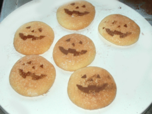 ⑭顔の付けた生地が上に来るようにし、間にかぼちゃクリームを挟んだら完成です。