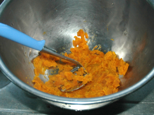⑩かぼちゃの黄色い部分だけをスプーンですくい取り、マッシャーなどでつぶします。