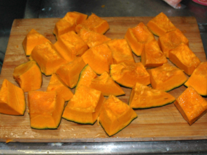 ![]() ①南瓜は種とワタを取り、一口大に切ります。 |