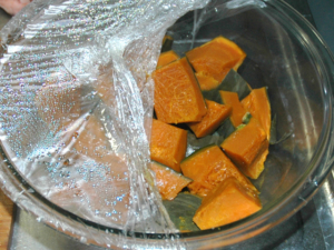 ![]() ②一旦水にくぐらせた南瓜を耐熱ボールに入れ、12~15分レンジで加熱して、竹串がすっと通るくくらいまで。 |