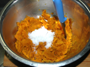 南瓜が柔らかい場合は、きなこを加えると、固さがちょうど良くなります。
