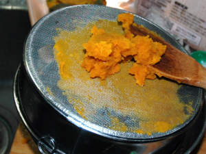 ![]() ⑤つぶした南瓜は、裏ごしをします。 (練り餡くらいの固さになったらOKです。) ⑥柔らかいようなら、きなこ(分量外)を少量ずつ加え、固さを整えます。 |