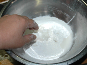 ![]() ⑦ボールに白玉粉と上新粉を入れて混ぜたら、水を少しずつ加えて、その都度良く混ぜましょう。 |