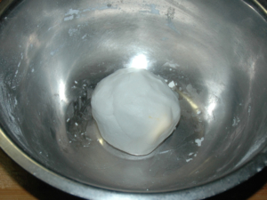![]() ⑧耳たぶくらいの柔らかさになったら、一つにまとめます。 |