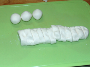 ![]() ⑨白玉を16等分し、それぞれ団子状に丸めます。 |