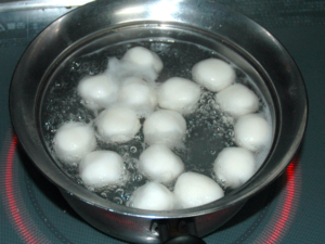 ![]() ⑩お湯を沸かし、白玉団子をゆで、浮いてきたら、更に3分加熱しましょう。 ⑪終わったら、すぐに氷と水が入ったボールに入れ、しっかりと冷まします。 |