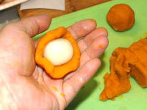 ![]() ⑫南瓜も団子と同じく16等分し、団子状に丸め、生地を一つ手に取り、一つずつ団子を南瓜で覆います。 |