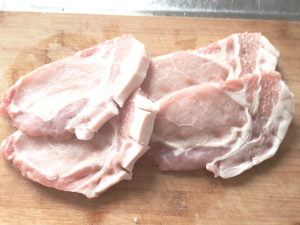 ![]() 1:豚肉は、身と脂身の間に垂直に切り込みを入れます。 (筋きりすると、揚げても縮みにくくなります。) |