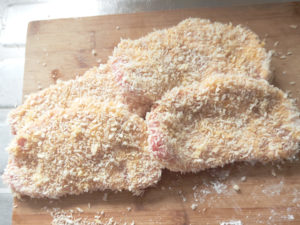 ![]() 2:豚肉に、薄力粉→溶き卵→パン粉の順に衣をつけましょう。 |