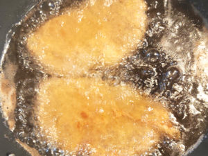 ![]() 3:180~190度の油で、表面がきつね色になるまで揚げます。 (裏表で、3~4分ずつくらいが目安です。) |