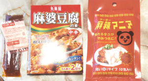 ![]() 5:今回は丸美屋の麻婆豆腐の素と100均の麻辣マニアを使いました。 |