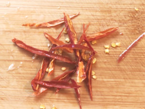 ![]() 9:唐辛子はハサミを使って、細切りにします。 (辛いのが苦手な方は、入れなくても大丈夫です。) |