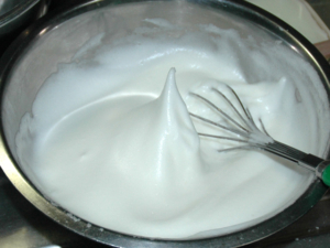![]() ①卵白に卵白用の砂糖をひとつまみ加えて泡立て始め、途中で2回に分けて卵白用の残りの砂糖を加えながら、ピンと角が立つまで泡立てます。 |