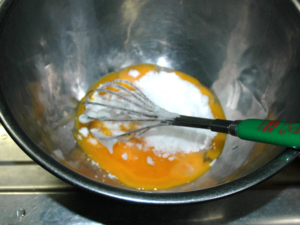 ![]() ②卵黄のボールに卵黄用の砂糖を全量加え、白っぽくもったりするまで泡立てます。 |