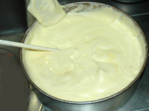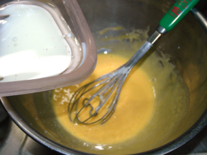 ![]() ③牛乳とサラダ油を一緒の器に入れ、レンジで30秒ほど加熱し、人肌の温度になったら、卵黄のボールに少しずつ加え、その都度良く混ぜましょう。 |