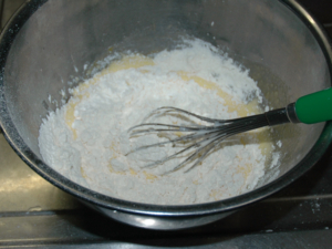 ![]() ④卵黄のボールに薄力粉をふるい入れ、粉っぽさがなくなるまで混ぜます。 |