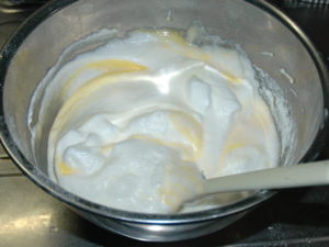 ![]() ⑤卵白のボールに卵黄のボールの中身を全部あけ、ゴムべらに持ちかえてさっくりと練らないように混ぜます。 (平仮名の「の」の字をイメージして下さい。) |