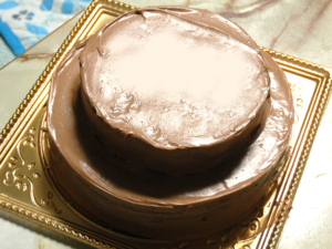 ![]() ⑩まず21cmのケーキの表面をチョコクリームで覆い、上に15cmのケーキも乗せて全体をチョコクリームで覆います。 (回転台の上で作業すると楽です。) |