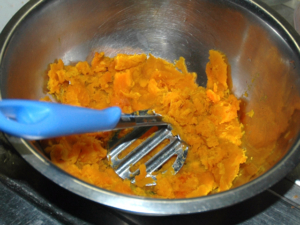 ![]() ⑪チョコクリームの次に、南瓜クリームを作ります。 ⑫南瓜を適当な大きさに切り、水にくぐらせてから、ラップをしてレンジで8~10分加熱し、皮を取り除いて、温かいうちにマッシャーなどでつぶします。 |