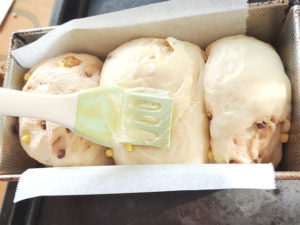 13:溶かした塗る用マーガリンを生地の上面にたっぷりと刷毛で塗りましょう。